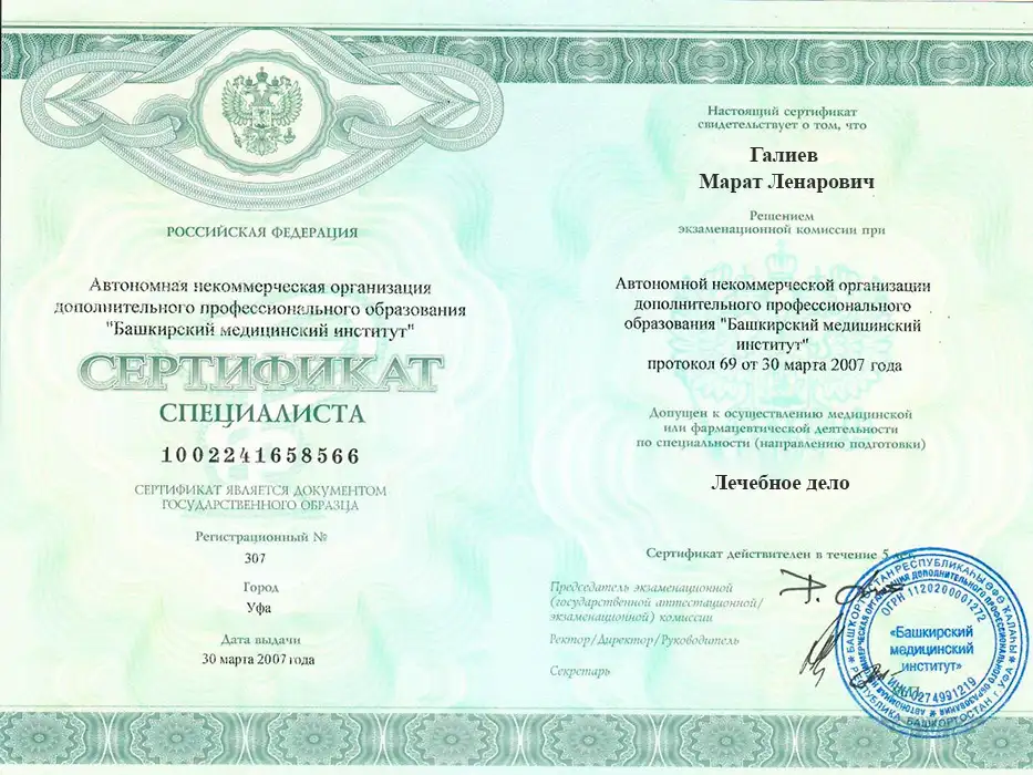 • 2017 — АНО ДПО "Башкирский медицинский институт" – повышение квалификации по специальности "лечебное дело"